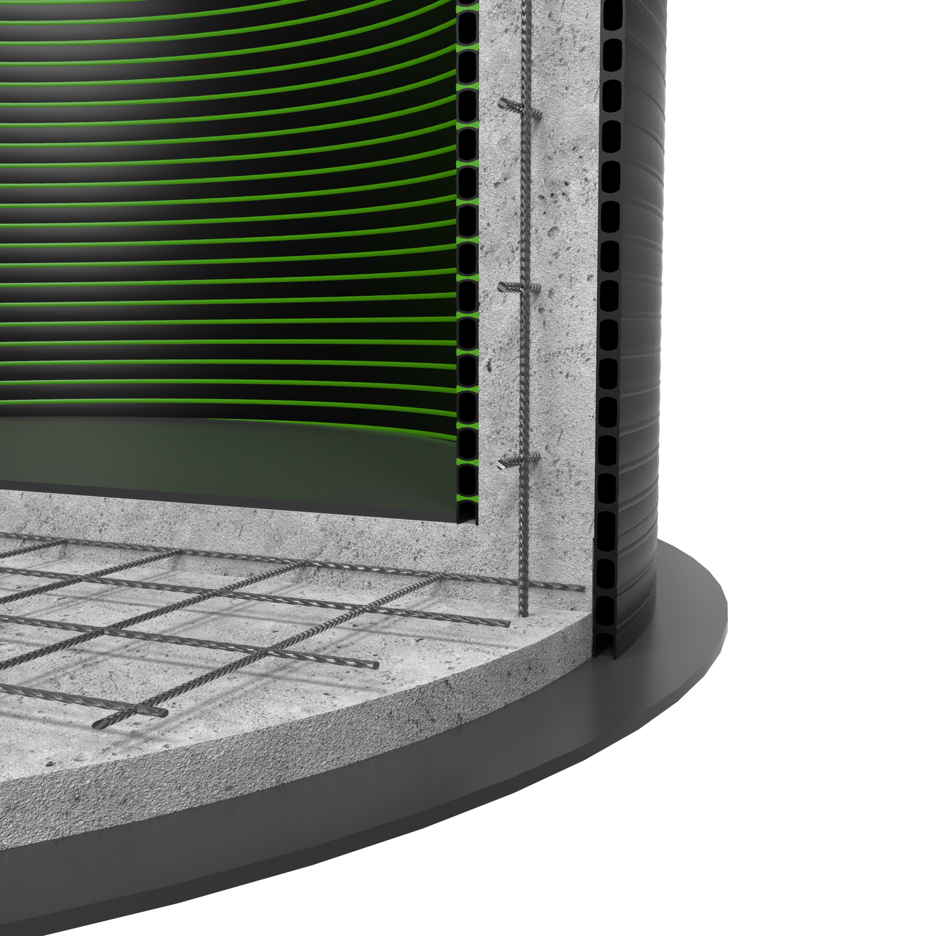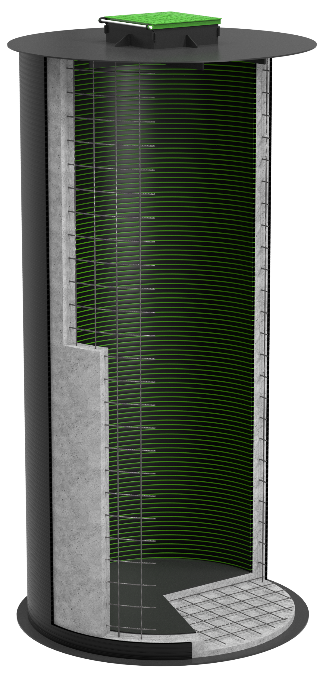 Внешний слой из спиральновитой трубы KANN или футеровочный ПНД лист (защита от грунтовых вод, коррозии, химически агрессивных грунтов).